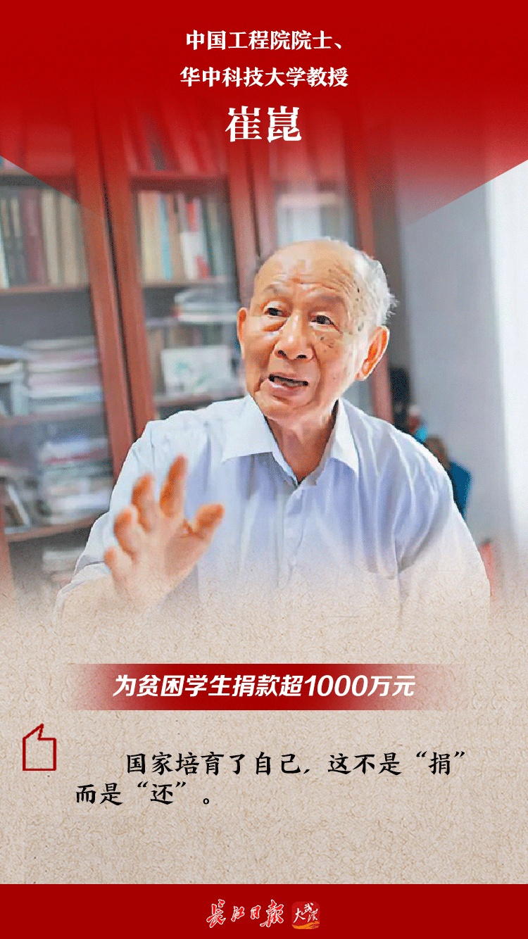 华中科技大学96岁高龄的崔崑教授是中国工程院院士,金属材料专家。多年来,他和夫人朱慧楠教授捐资助学已超1000万元,这几乎是他们毕生全部的积蓄。