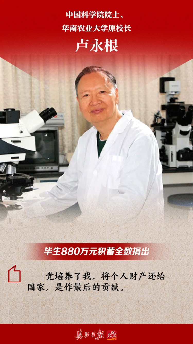2017年3月,87岁的卢永根院士在夫人徐雪宾教授的搀扶下来到银行,将十多个存折的存款转入华南农业大学的账户,卢永根夫妇一共捐出8809446.44元,这是他们毕生的积蓄。