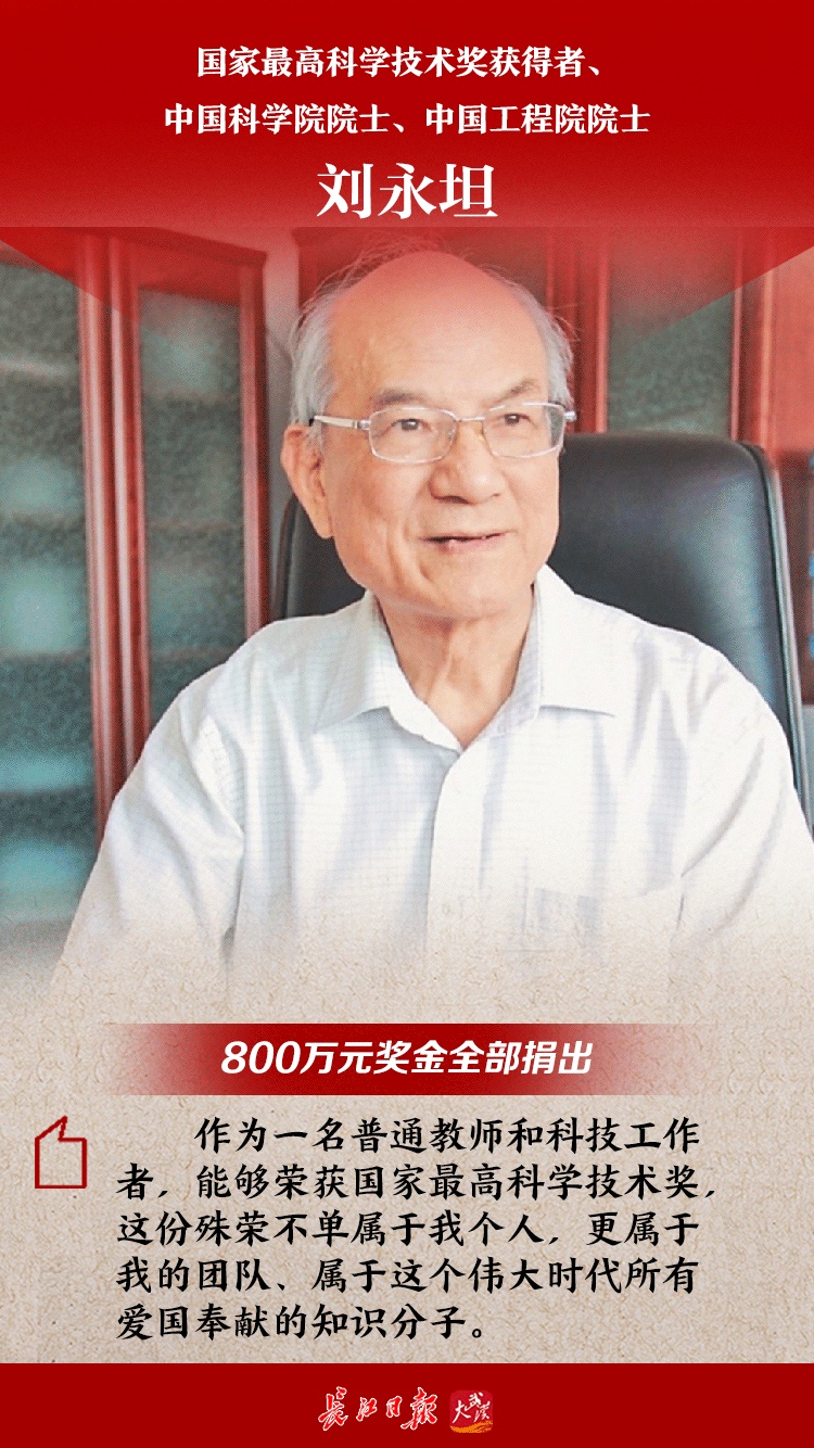 “作为一名普通教师和科技工作者,能够荣获国家最高科学技术奖,这份殊荣不单属于我个人,更属于我的团队、属于这个伟大时代所有爱国奉献的知识分子。”2020年8月3日,国家最高科学技术奖获得者、中国科学院院士、中国工程院院士,哈尔滨工业大学刘永坦教授将国家最高科学技术奖800万元奖金全部捐出,设立永瑞基金,用于学校电子与信息学科人才培养。