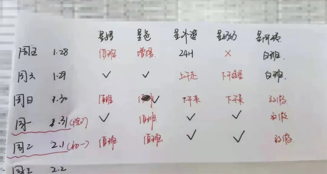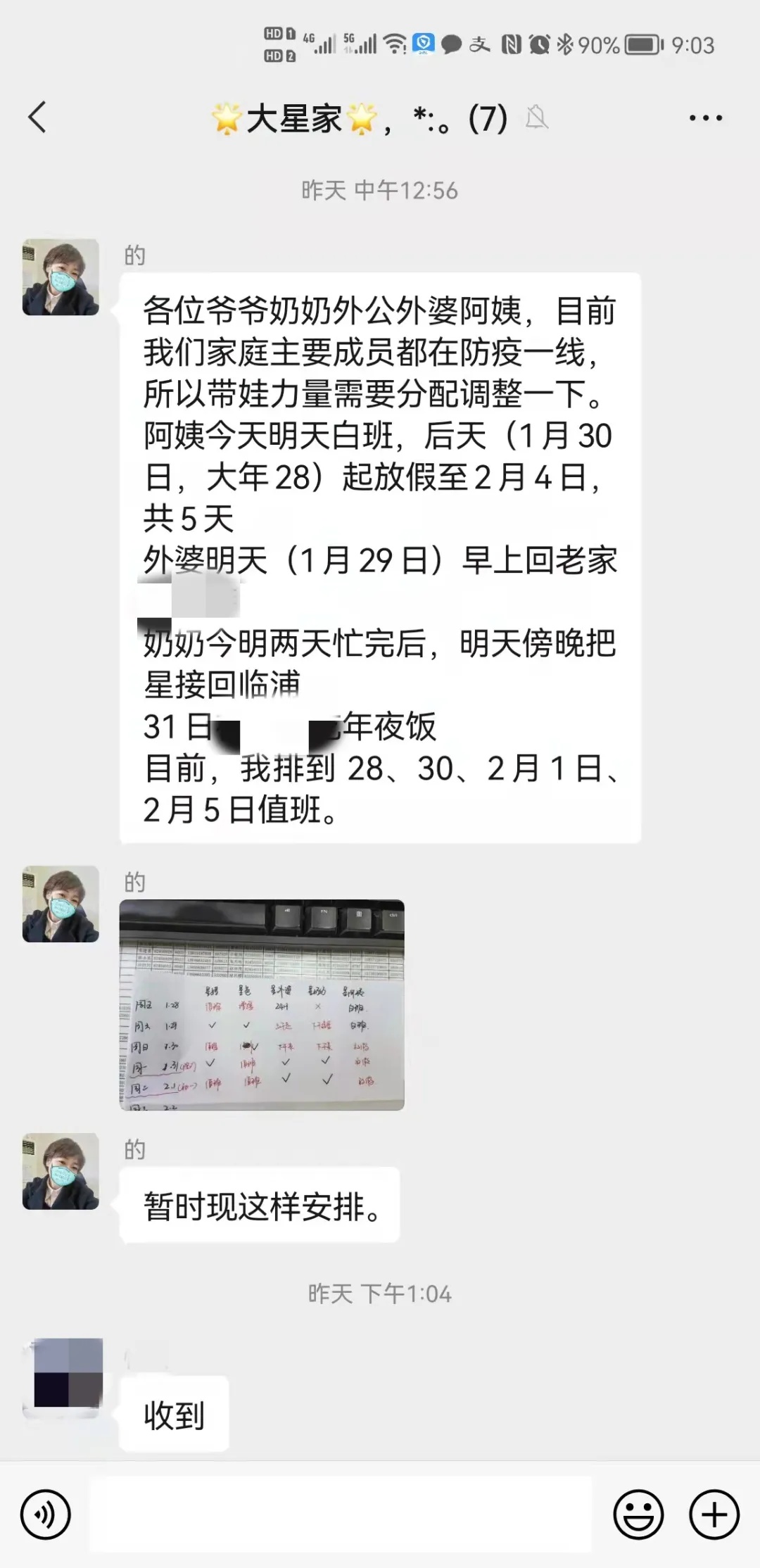 夫妻俩都坚守在抗疫一线,最放心不下的就是孩子。为了能在兼顾工作的同时,更好地照顾家中日常,周梦兰在家人群里说明了情况,在夫妻俩上班与值班的时间段,妥妥地给家里四位老人排了“春节值班表”,4位老人对晚辈的工作表示理解与支持,为同一个目标,坚定地守护着家的后方。