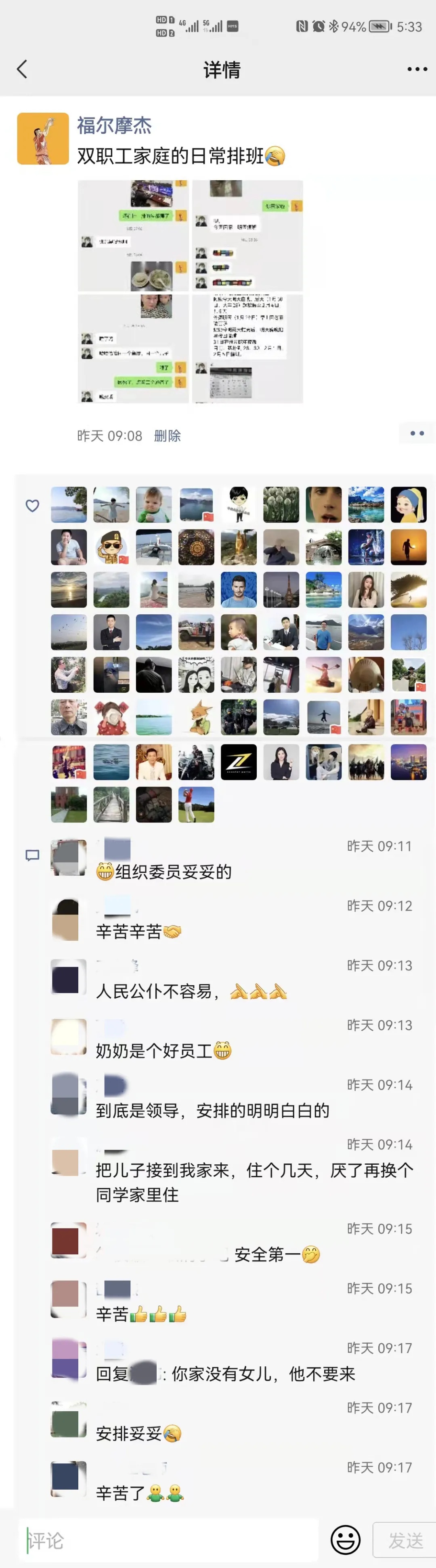 “目前我们家庭主要成员都在防疫一线,所以带娃力量需要分配调整一下……”