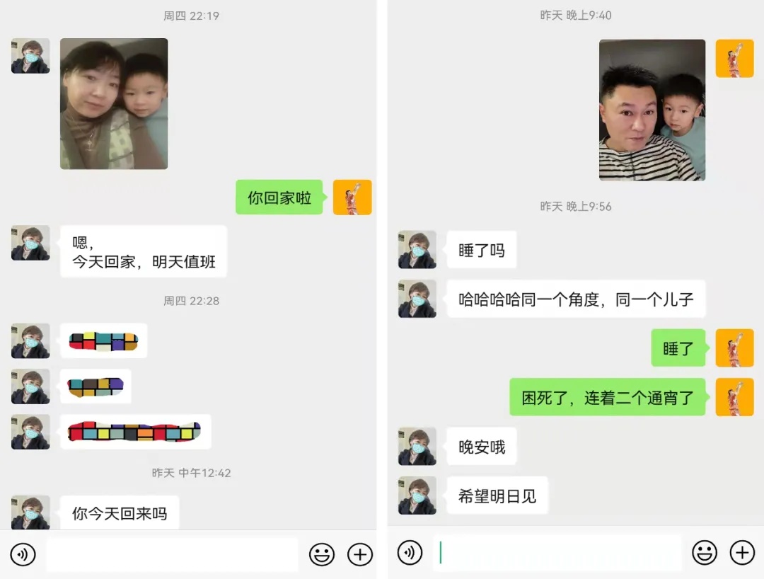 随着形势日渐向好,忙活到深夜的谭华杰终于能抽出时间回家休整。看到还在等自己回家的儿子,谭华杰很心疼,跟儿子拍了张合影,发给了仍在岗位忙碌的妻子。