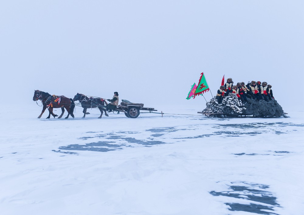 到达冰面时,夜色依旧。澄净的冰面上,马拉着爬犁带着捕鱼的“鱼把头”和渔工向前行进。