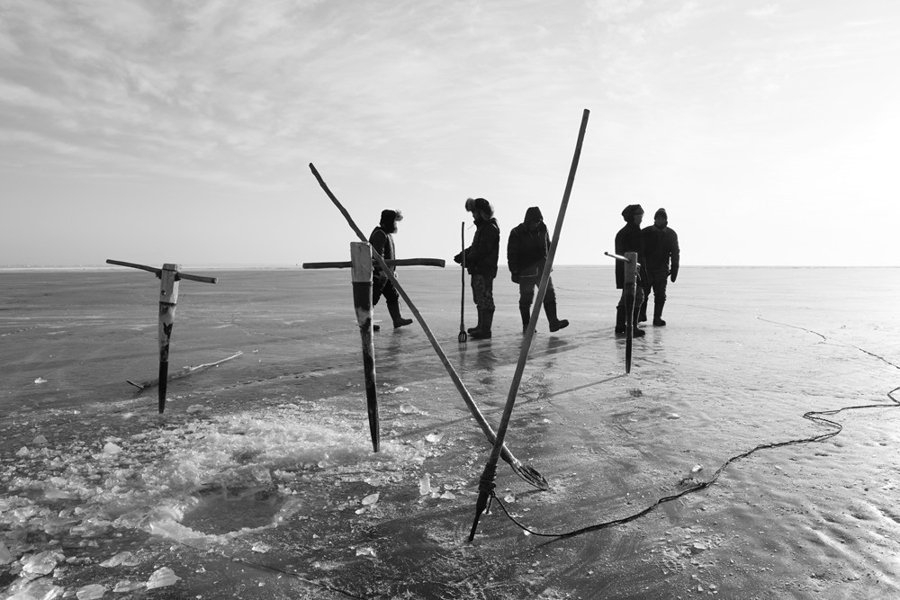 到达预期地点,张文和渔工们迅速进入工作状态。识冰、镩冰、布网、出网,这是冬捕的四个关键环节。
