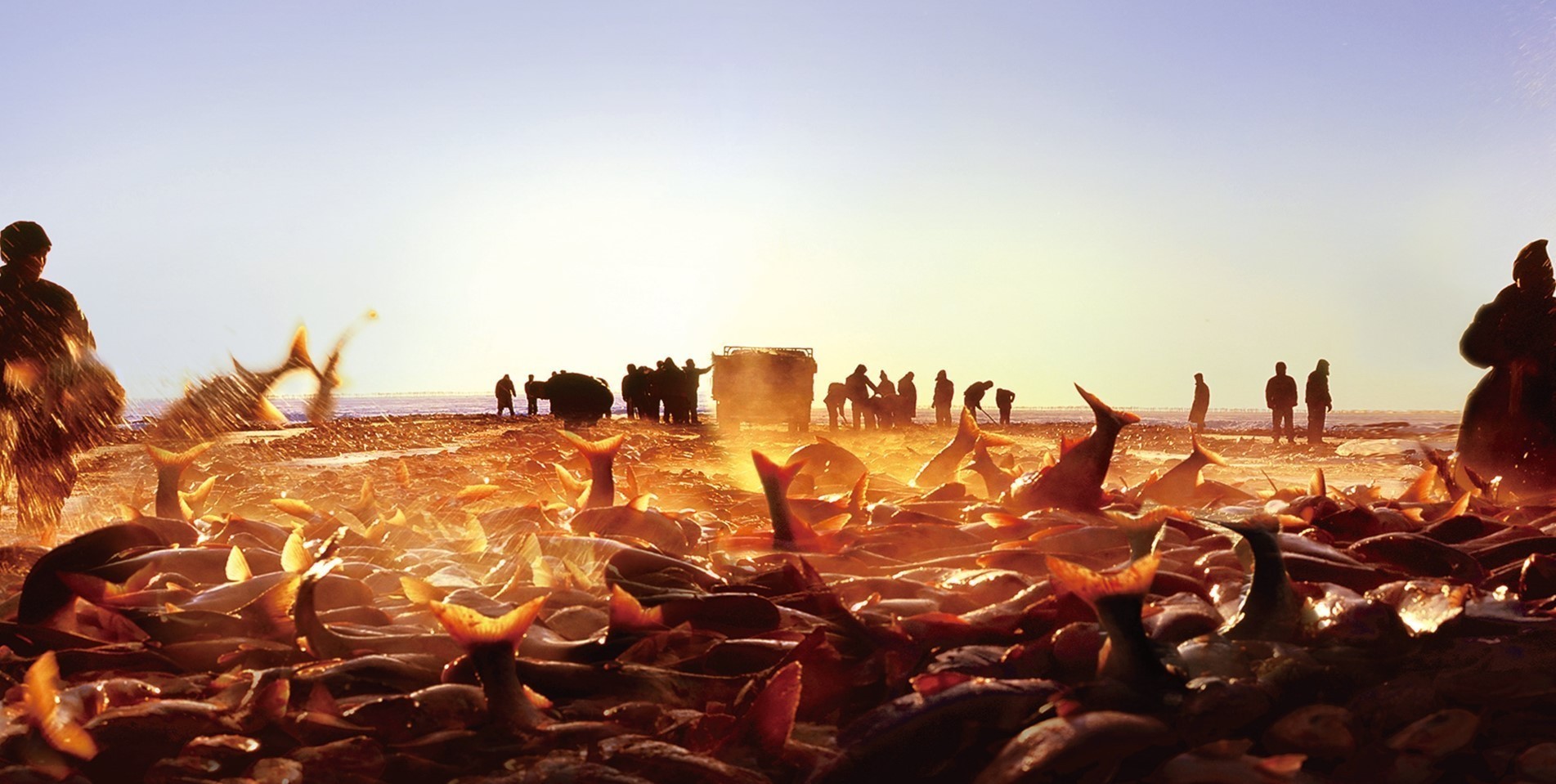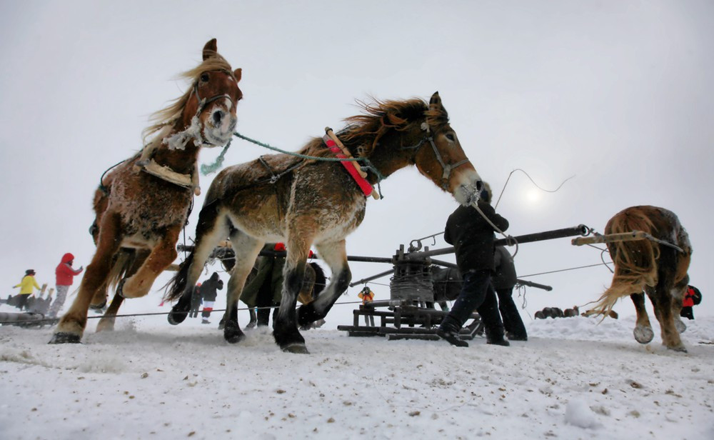 出网,依靠马拉绞盘。4匹健硕的马儿拉着绞盘打转,马蹄踏雪,渔网破冰,缓缓而出。万尾鲜鱼破冰而出,冒着“热气”冰上劲舞。