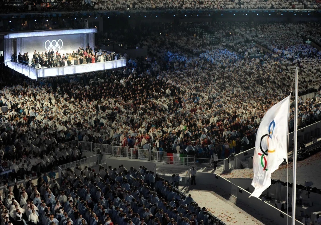 第21届冬季奥林匹克运动会开幕式在加拿大温哥华举行。这是开幕式上,国际奥委会会旗缓缓降下。为悼念在训练中因碰撞事故不治身亡的格鲁吉亚雪橇选手诺达尔·库马里塔什威利,冬奥会组委会和国际奥委会在开幕式上降半旗致哀。新华社记者 杨磊 摄