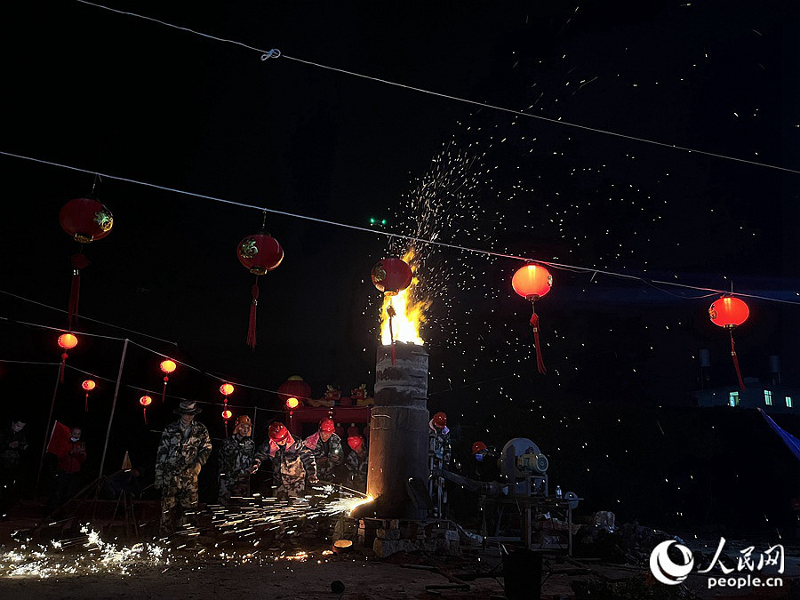 当晚,匠人先将碎铁投入2米多高的火炉中,猛火烧炉,直至生铁融化成铁水;再将高达1300多摄氏度的铁水舀起,倾于竹片内,用木槌击打,泼向枝繁叶茂的荔枝树。当铁水与树叶相撞,霎时星火四溅,飞花如雪,产生震撼效果。