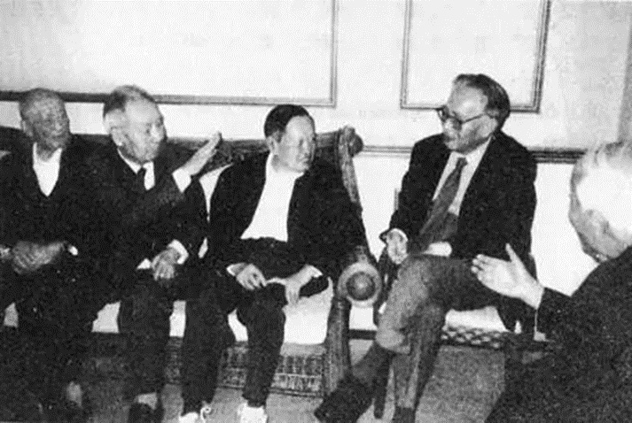 从左到右:朱光亚(两弹一星功勋科学家)、许渊冲(翻译终身成就奖)、杨振宁(诺贝尔物理学奖)、王传纶(金融终身成就奖)、王希季(两弹一星功勋科学家),西南联大五才子,并称为“文理法工五堵墙”。