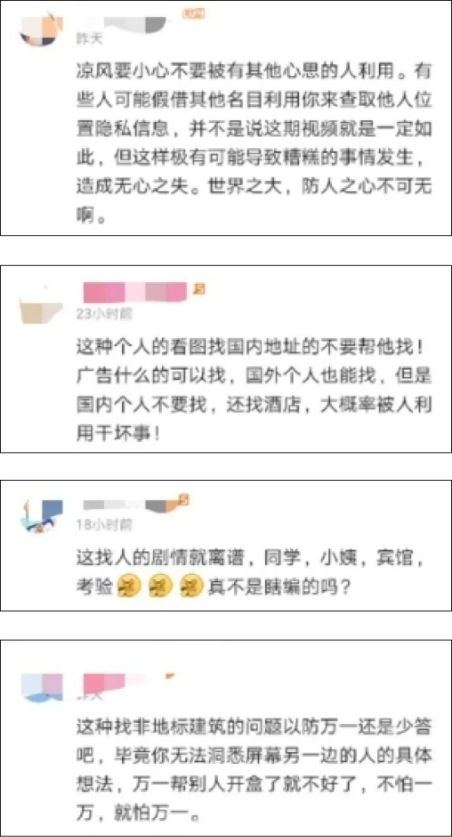 对于该视频,不少网友表示担忧:万一这位粉丝对照片拍摄者有什么不良意图,此举岂不是害了对方?更何况,这种“人肉搜索”的方法如果因此流传出来,也会成为别有用心之人的助力。