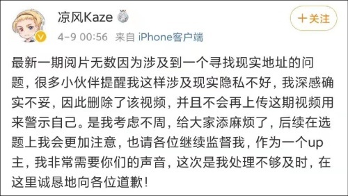 4月9日凌晨,“凉风Kaze”在B站动态和个人微博发布道歉,表示自己感到视频内容不妥,“因此删除了该视频,并且不会再上传这期视频用来警示自己”,后续会在选题上更加注意。