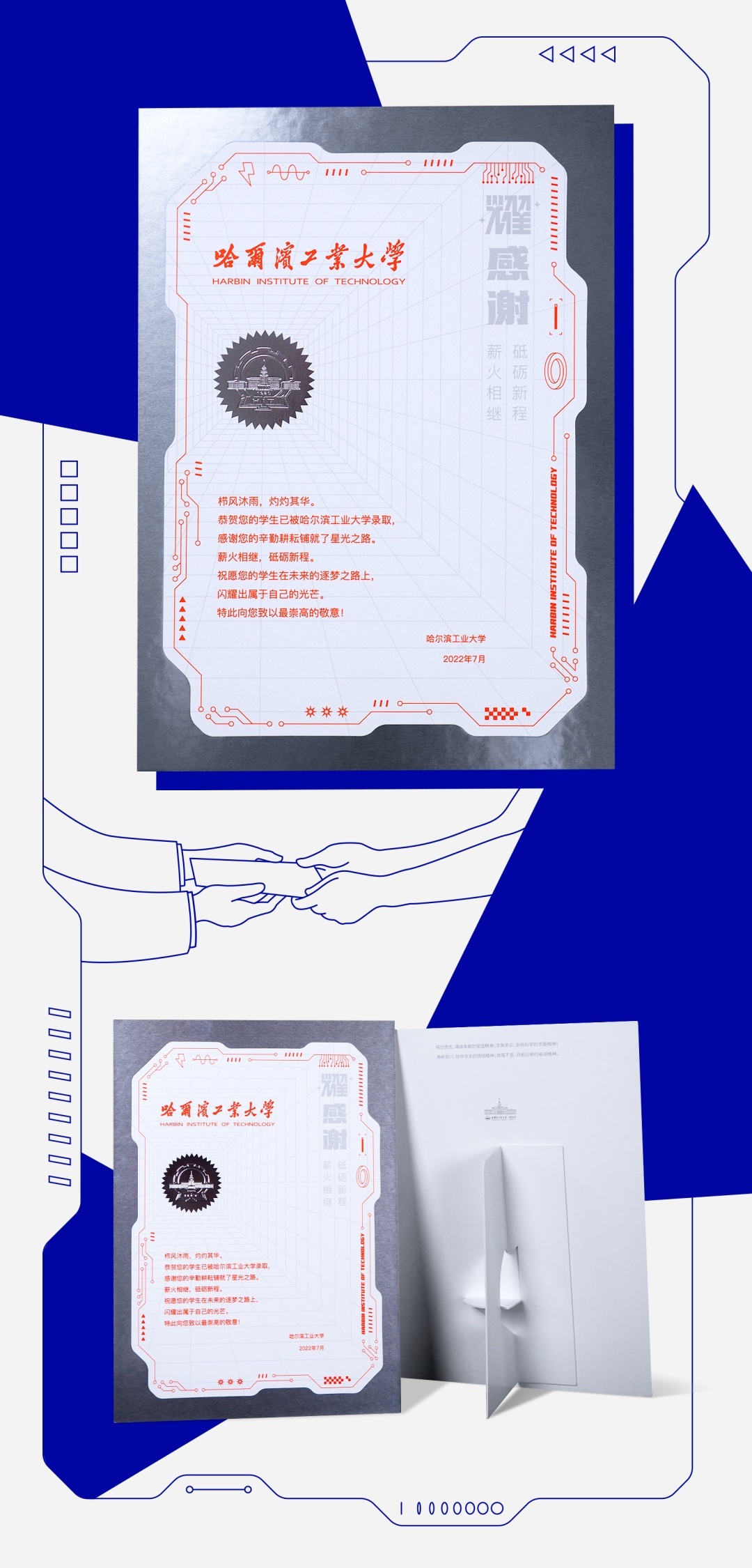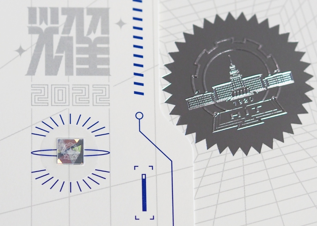 哈工大录取通知书外观似芯片主板,未来科技感十足。学校自主研制的金刚石/蓝宝石封固在录取通知书的右侧。