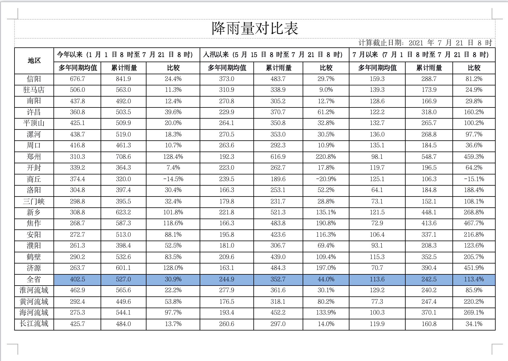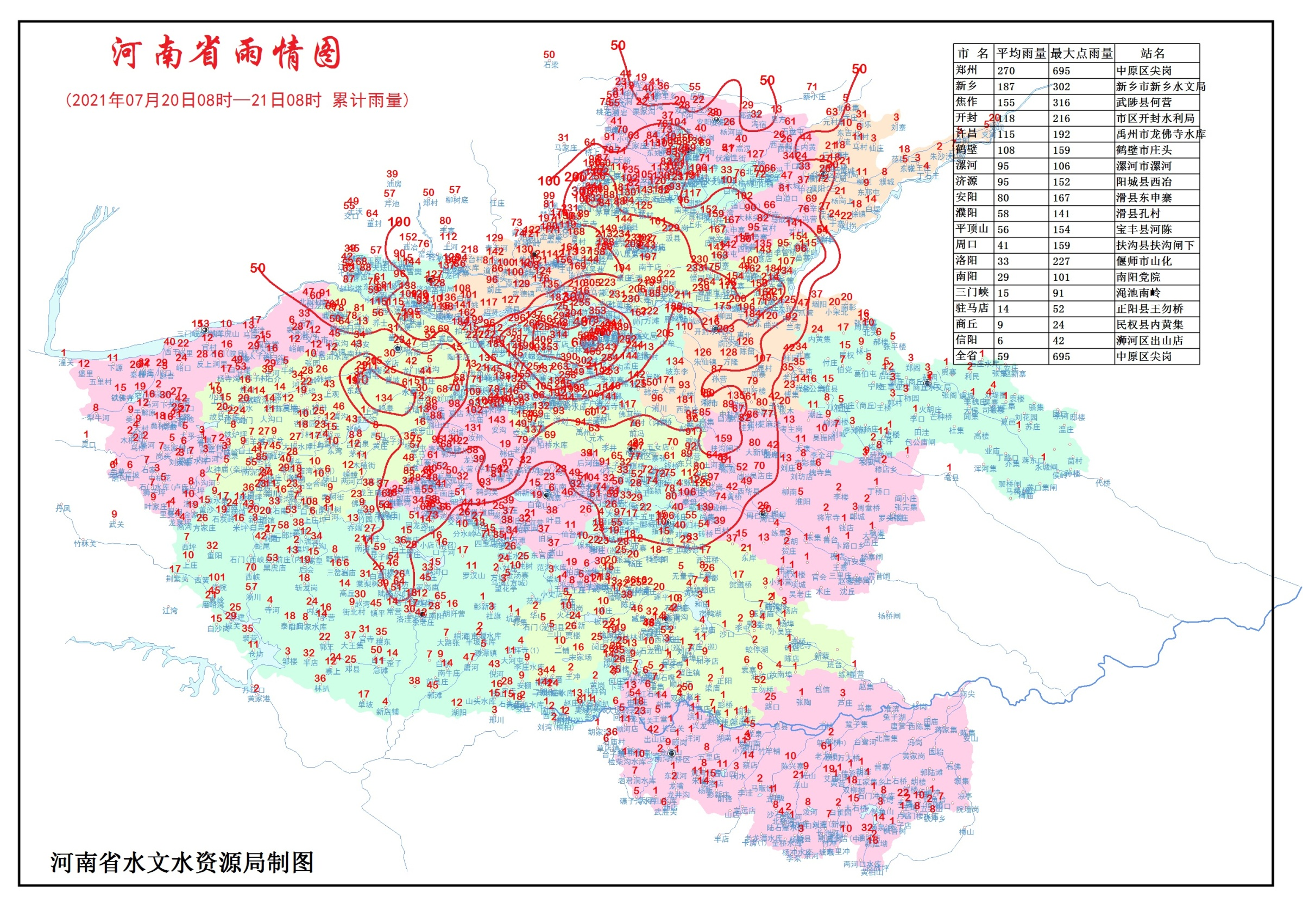 据通报,常庄水库站降雨量633mm。降雨量超600mm站点2处,超500mm站点10处,超400mm站点27 处,超300mm站点61处,1小时超50mm站点194处,60分钟最大降雨量郑东新区水利设计院雨量站167.5mm。平均降雨量:全省59mm,郑州市270mm,新乡市187mm,焦作市155mm,开封、许昌、鹤壁市108~118mm、漯河、济源市95mm,安阳市80mm,濮阳、平顶山、周口市41~58mm,洛阳、南阳、三门峡15~33mm,其他市小于15mm。