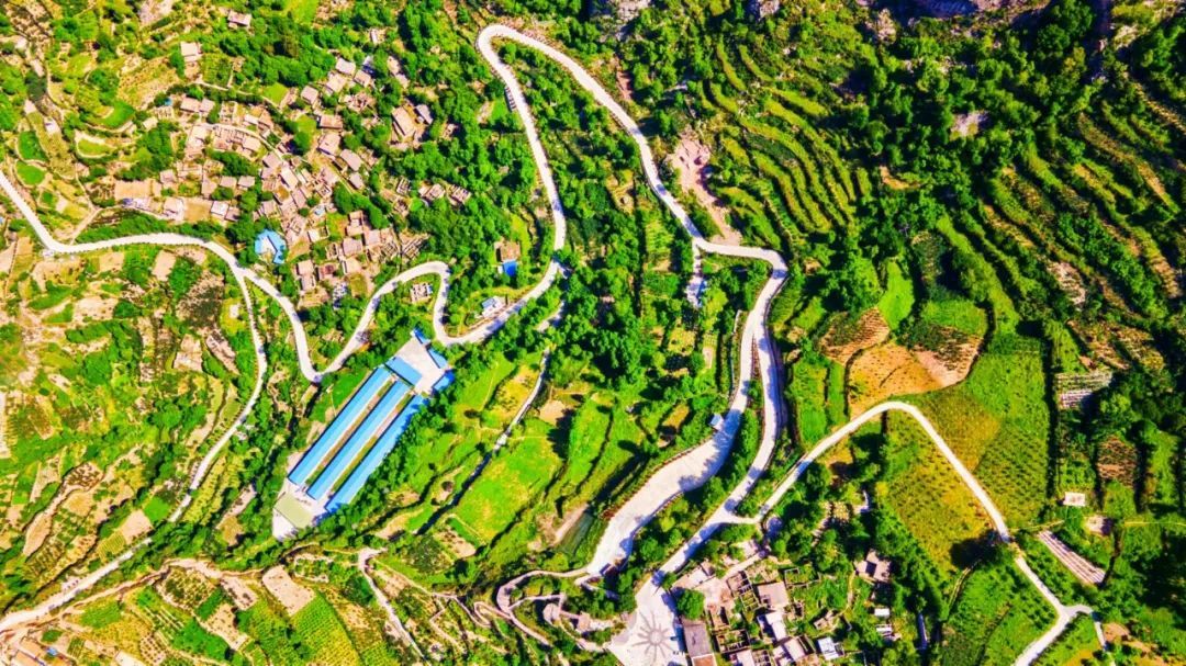 初夏时节,高空俯瞰宕昌县南腊公路,雕刻花纹清晰精美,红色符号还原历史沧桑,全线构成了“一洞一幅画、一桥一铭石、一站一风貌、一区一景观”的亮丽公路风景线。