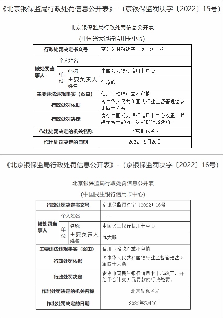 6月2日,中国银行保险监督管理委员会北京监管局(以下简称北京银保监局)连发两张罚单:中国光大银行信用卡中心(以下简称光大信用卡中心)因信用卡催收严重不审慎,被责令改正,并给予合计80万元罚款的行政处罚,处罚日期为今年5月26日。中国民生银行信用卡中心(以下简称民生信用卡中心)也于同日受到责令改正、罚款80万元的处罚,违规事由和光大信用卡中心如出一辙。