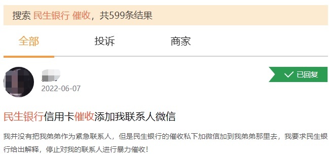 民生信用卡在该平台上有近600条催收投诉。消费者骆小姐5月28日投诉称,自己在和银行协商好分期还款后,一大早收到两条催收短信,内容为“你已被我行正式列为起诉人员,开庭文书将快递发送户籍地址,请下午3点前处理可撤案”。多数投诉人反映,民生信用卡中心催收人员采取上门恐吓、连续打电话等方式催收。
