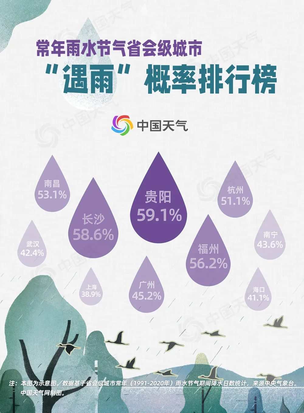 中国天气网统计了常年全国省会级城市在雨水节气期间的降水概率,发现“遇雨”概率前十名的城市全部集中在南方。其中,贵阳以59.1%的概率拔得头筹,第二位到第五位分别是长沙、福州、南昌和杭州,“遇雨”概率都在50%以上。