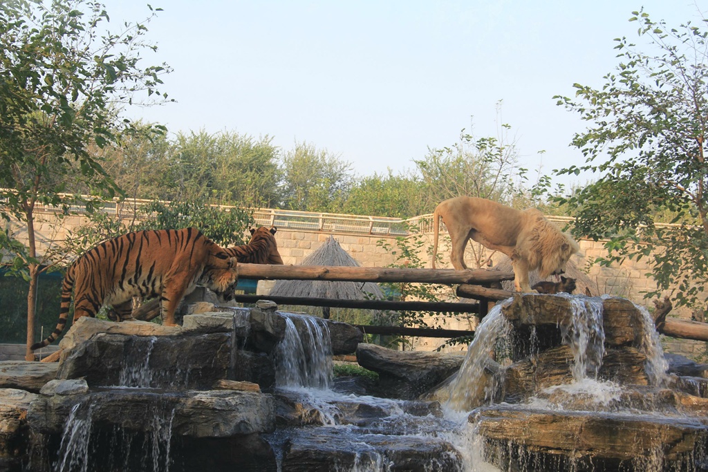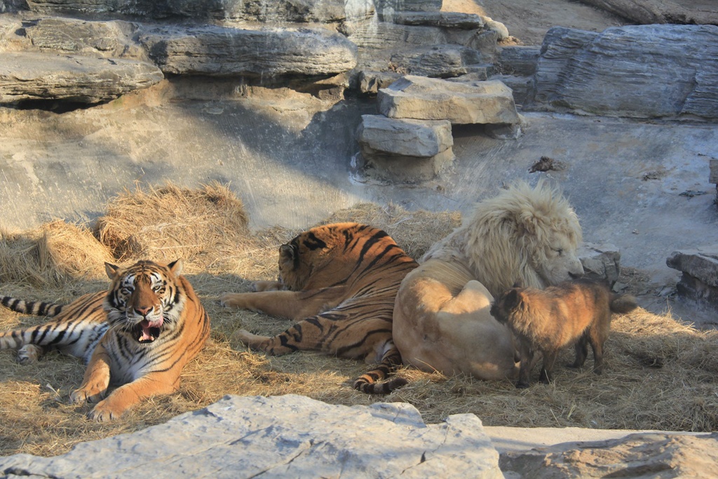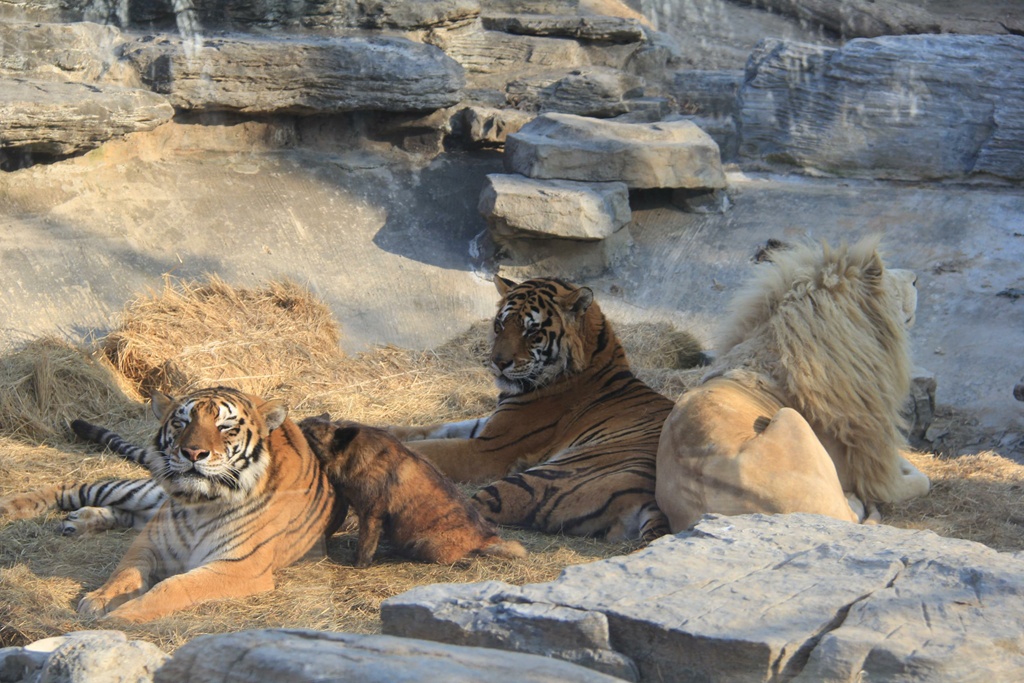在北京野生动物园里,有这样一个特殊的组合。一只白狮、两只东北虎、一只柴狗,它们每天在一起共同生活,嬉戏打闹。不少游客在感觉新奇有爱的同时,也不免有些担心:小狗竟然不害怕被狮子老虎吃掉?对此,野生动物园相关负责人解释:“狮虎狗”是兄妹,从小吃同一只狗妈妈的奶长大,已经和睦相处近8年。