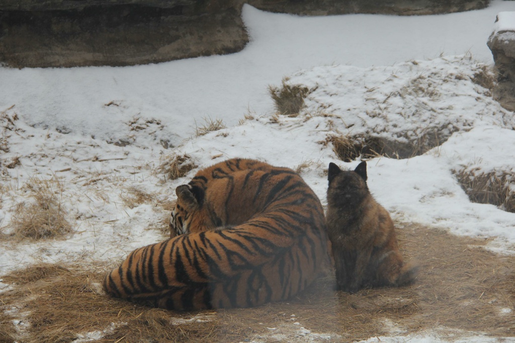 中午时分,野生动物园的狮虎馆中,一只白狮、两只东北虎正在懒洋洋地趴着晒太阳,令人新奇的是,有一只体型娇小的黑棕色小狗毫无畏惧地依偎在白狮身边。不一会儿,小狗翻了个身,冲白狮撒起了娇,平日里威风的狮子马上俯下头,充满爱意地用鼻子蹭蹭小狗的肚皮,为它挠痒痒。小狗也很调皮,反过身来,跳到狮子的身上咬咬它的耳朵,舔舔它的后背,这样的温馨场面让在场的游客感觉十分有爱。