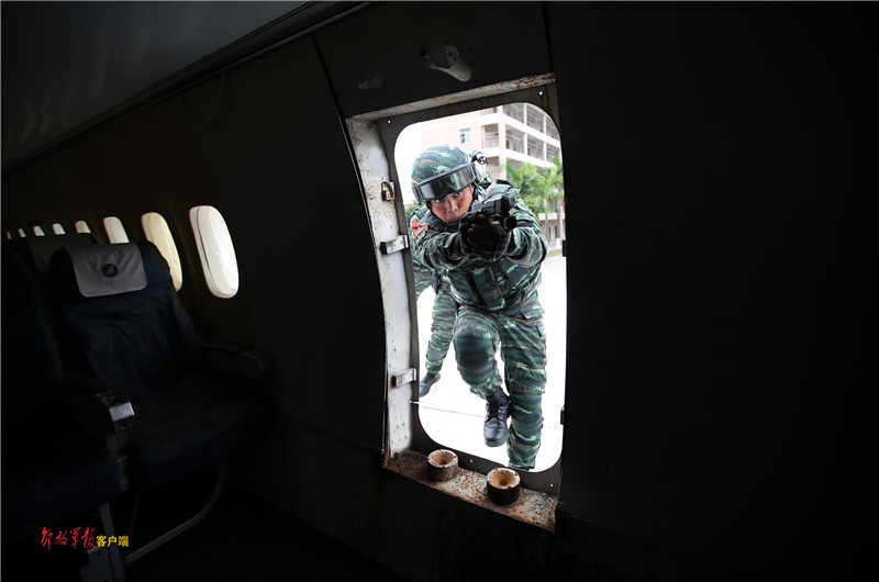 反劫机演练中彭星打开舱门率先突入。(潘桂添 摄)