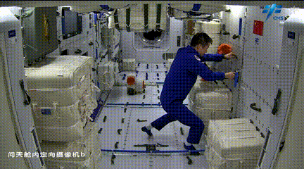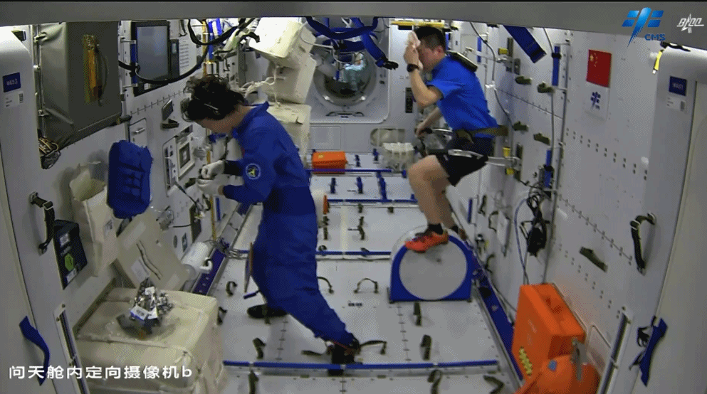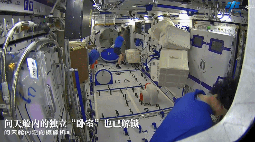 问天舱扩展了航天员们的生活、工作空间,航天员们将太空自行车搬到了问天舱内,业余时间进行锻炼。