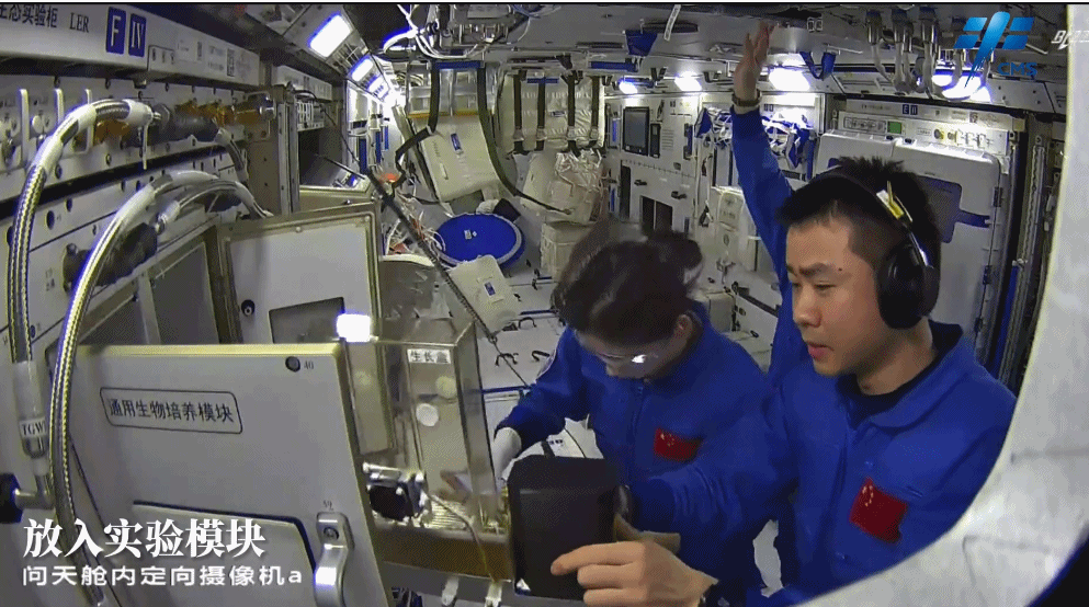 航天员打开通用生物培养模块,进行解锁、安装与基础功能测试。放入实验模块,完成生命生态实验柜在轨设置相关工作。