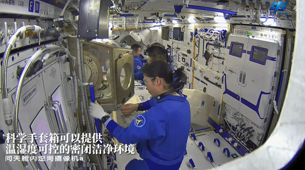 航天员解锁和安装科学手套箱。科学手套箱可以提供温湿度可控的密闭洁净环境,为开展生命科学、材料科学等学科领域的空间实验、试验提供支持,还可以协助航天员在轨实现精细操作或重复操作的科学实验。