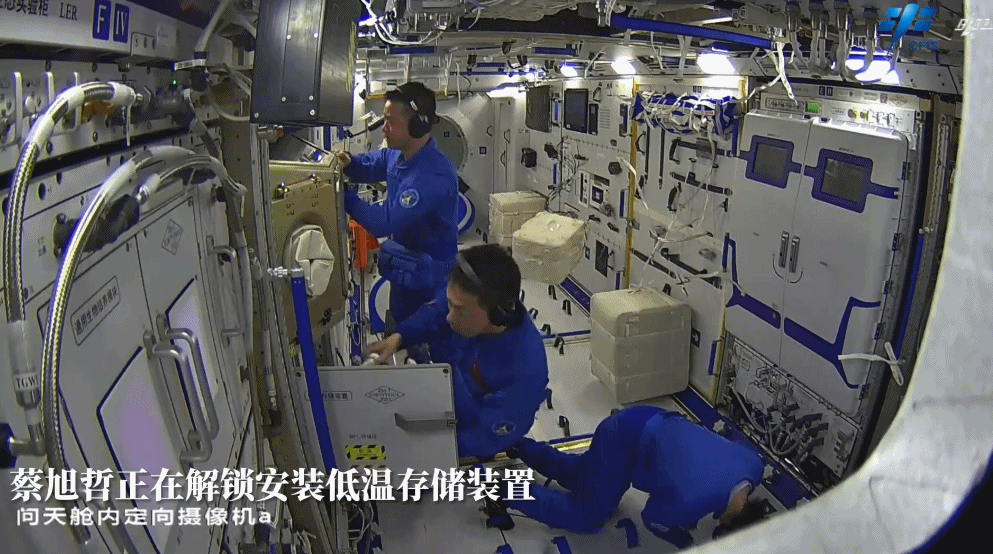 航天员解锁和安装低温存储装置。这个装置相当于一个冰箱,它可以提供零上4℃、零下20℃、零下80℃的低温存储能力,满足不同样品所需要的不同低温存储条件。