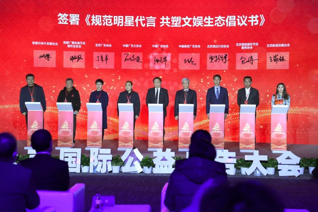 12月8日启动的第三届北京国际公益广告大会上,中国广告协会会长、广告道德委员会主任委员张国华代表中国广告协会、中国商务广告协会、中国广告主协会、北京广告协会、北京演出行业协会、首都广播电视节目制作业协会、北京网络视听节目服务协会、首都纪录片发展协会、北京影视动画协会九家单位,宣读了《规范明星代言 共塑文娱生态倡议书》。倡议书共五条: