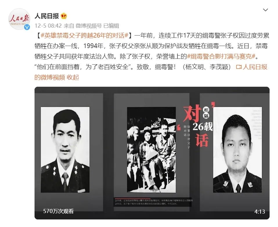 2020年12月15日,云南省临沧市公安局民警张子权牺牲在办案一线。26年前,他的父亲——临沧市镇康县公安局原军弄派出所所长张从顺在抓捕武装毒贩过程中壮烈牺牲。