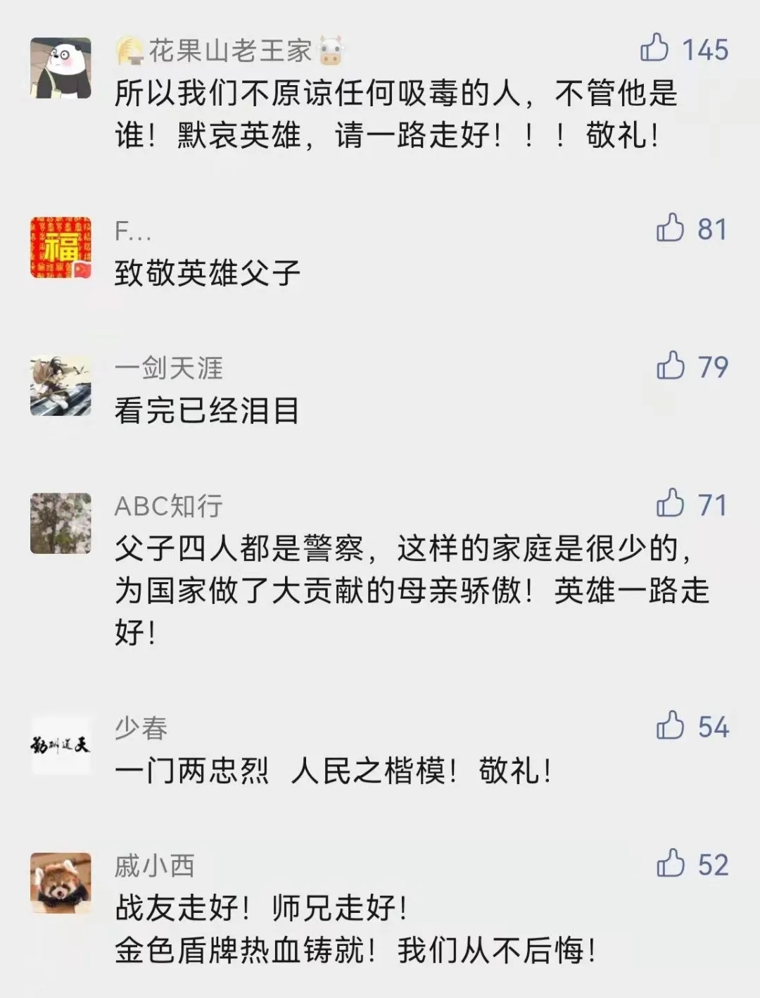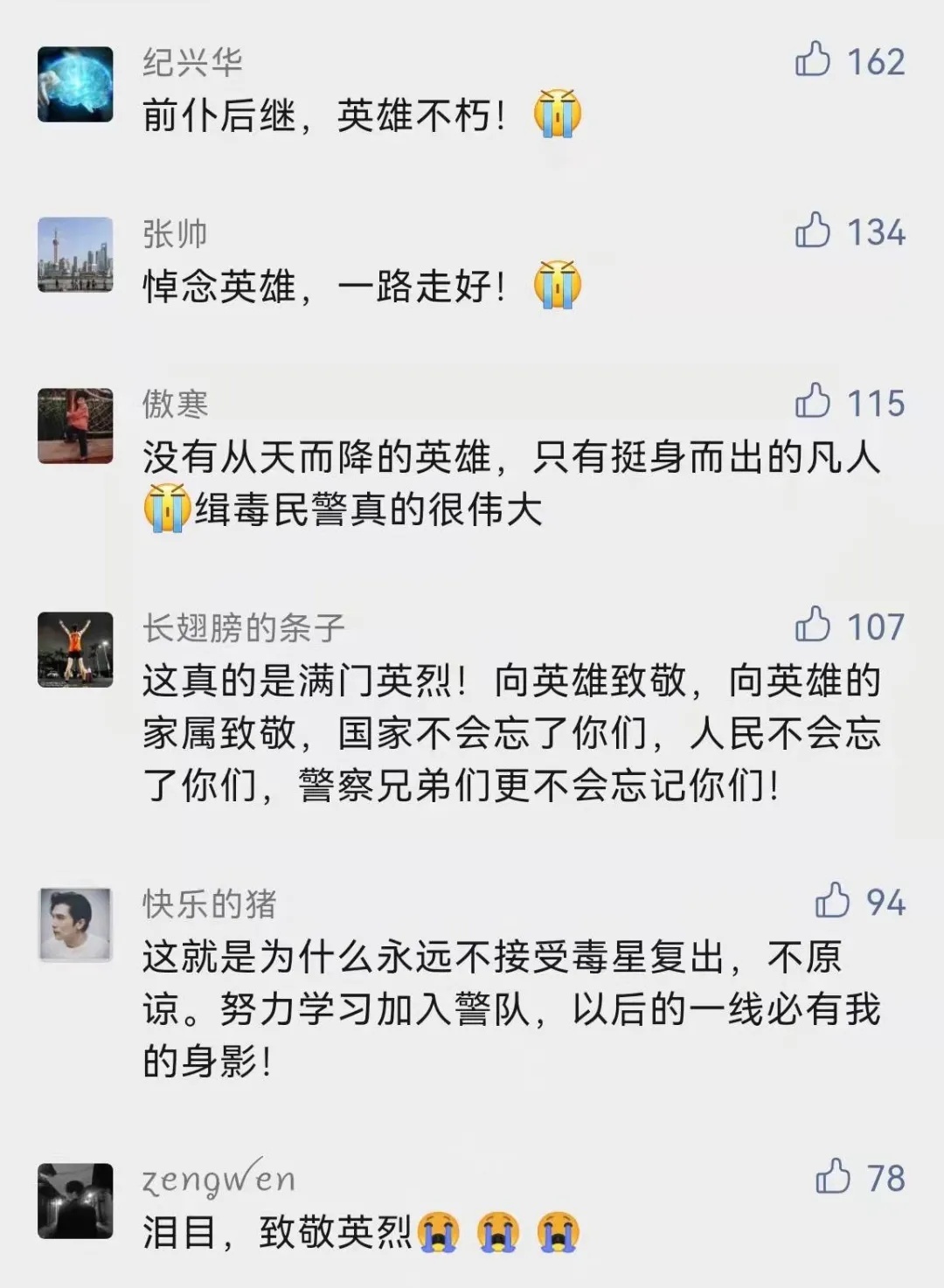 “之所以能生活在阳光下,是因为有人替我们挡住了黑暗!致敬中国缉毒警察!”“吸毒人员花的每一分钱都是打在缉毒警察身上的子弹”……无数网友写下了自己的心声。