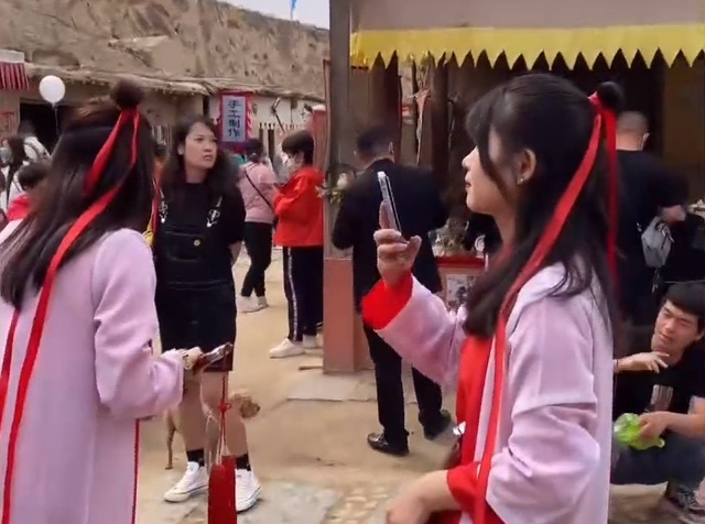 由于这里曾经是周星驰电影《大话西游》的取景地,紫霞仙子和至尊宝的形象深入人心。所以十一长假,很多人都来到了镇北堡游玩。也吸引了大批大批的乘客拍摄同款“紫霞仙子”照片。烫着卷发的“紫霞仙子”,还有“紫霞仙子”团队,大家都穿着一模一样的红色裙子,手里都拿着一模一样的宝剑,远远看过去,十个女生里面至少有八个都是这个造型,看得人眼花缭乱。