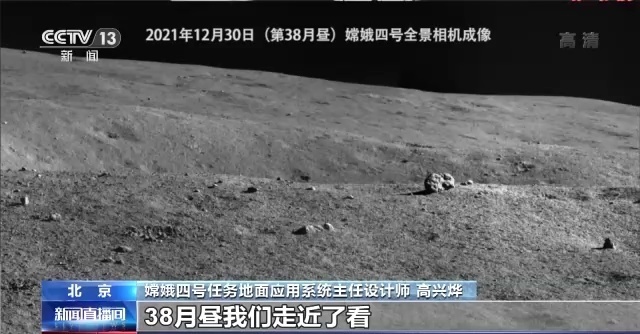 嫦娥四号任务地面应用系统主任设计师 高兴烨:38月昼我们走近了看,这个不是一个小房子,实际上是一个石块。我们发现石块的宽度大概是20公分,高度大概是10公分,背后有一个比较大的撞击坑,这个撞击坑的直径大概是22米。