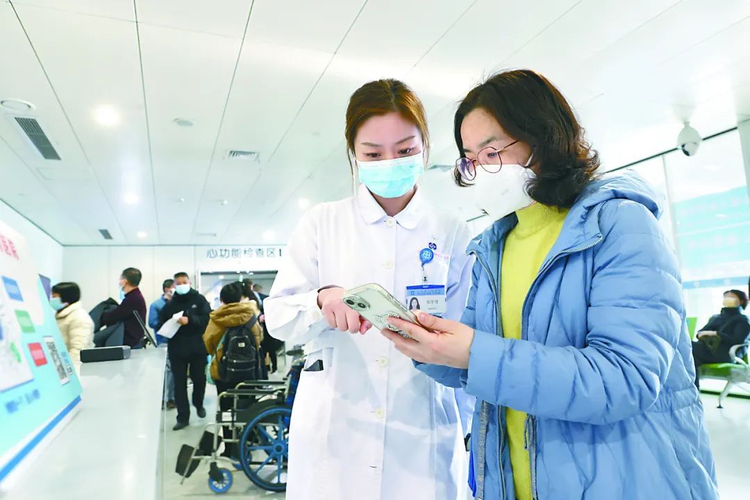 江苏省人民医院门诊部护士指导患者使用手机自助挂号。曹勇 摄