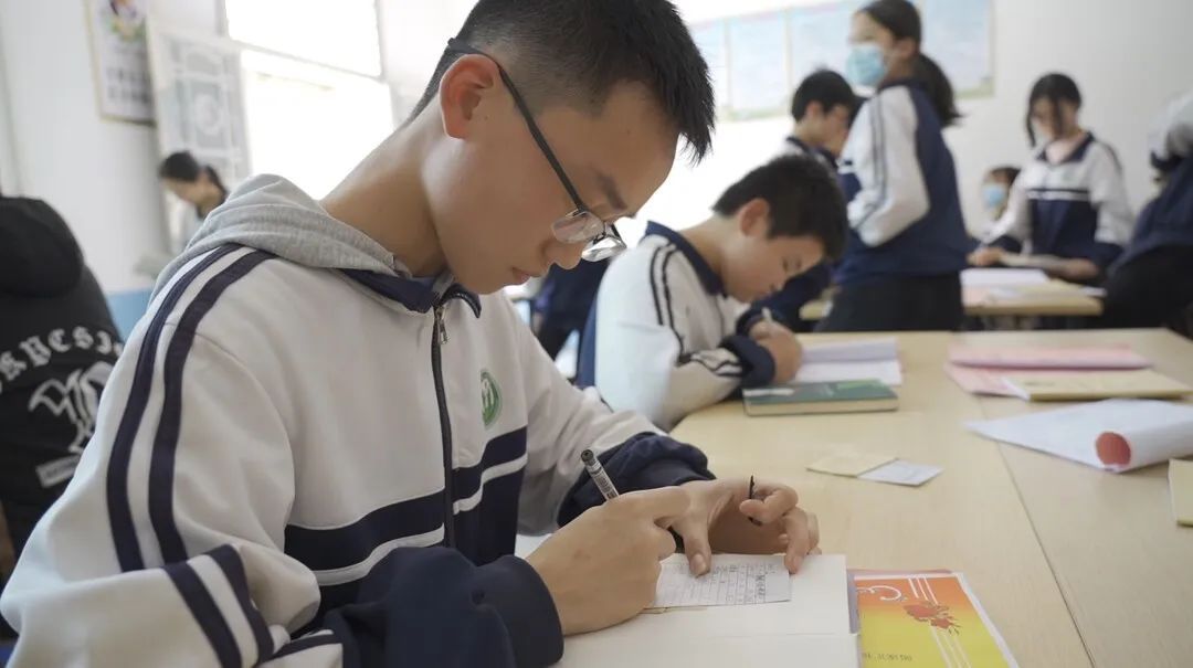 (甘棠镇小富中学学生认真填写填书卡。龙力 摄)