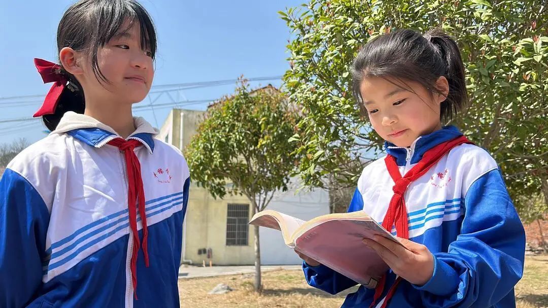 (甘棠镇丰稼明德小学学生邹蜜蜜与妹妹邹甜甜在交流阅读体会。龙力 摄)