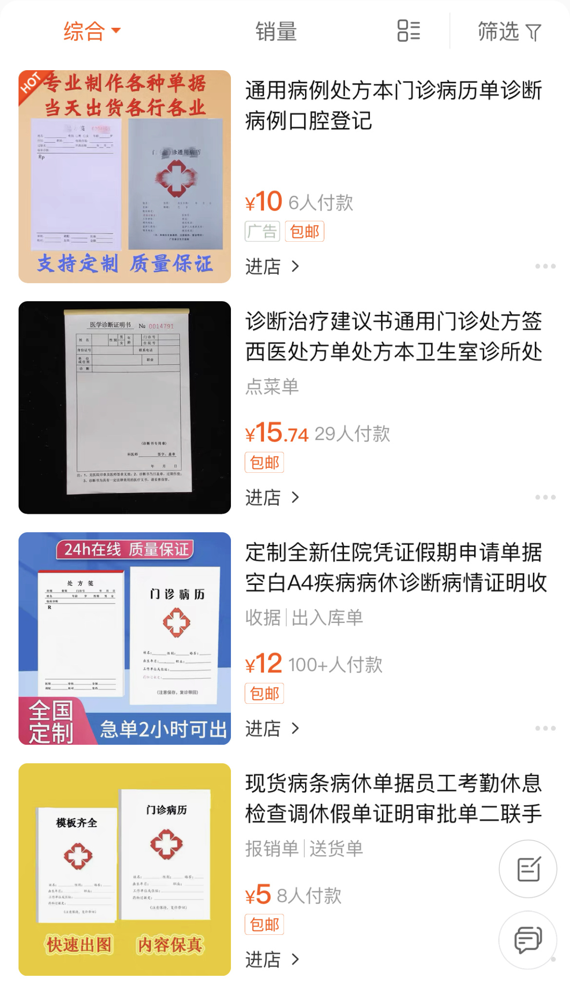 记者在电商平台上搜索“处方”“诊断”等关键词后,便出现了很多以门诊病历本为封面的产品列表。这些产品标题通常突出“定制”“住院凭证”“诊断病情”“证明”等关键词,销量较高的店铺一个月售出了3000件,产品标价多为10至20元不等。然而,当记者翻看产品详情页时,却发现几乎没有什么介绍,往往只留下一句:“请您联系客服后根据提示操作,私自拍下我们一律不予发货,此标价并非最终价格。”