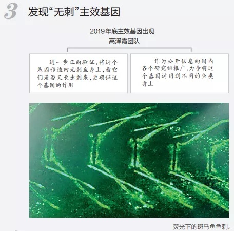 2019年底的一天,用高泽霞的话说,“突然一下子”,主效基因出现了,这次真的是无刺斑马鱼。几百条鱼无刺的表型非常稳定,再经过几代繁育,后代斑马鱼也都是无刺鱼。可以确定找到的就是主效基因,这是一个所有有刺鱼类都含有的共通基因。