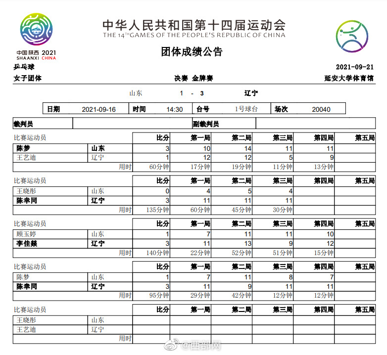 9月21日,十四运会乒乓球项目女子团体决赛在陕西延安举行,由陈梦、王晓彤、顾玉婷组成的山东队对阵由王艺迪、陈幸同、李佳燚组成的辽宁队。