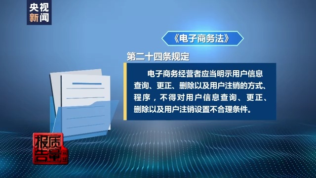 中国法学会消费者权益保护法研究会副秘书长 陈音江:电子商务法明确规定,电子商务经营者不得对用户信息的查询更正和删除,包括用户注销设置不合理的条件,注册的时候非常简单便捷,但是如果在注销的时候去设置不合理障碍来限制消费者去注销账户,显然是一种违法行为。