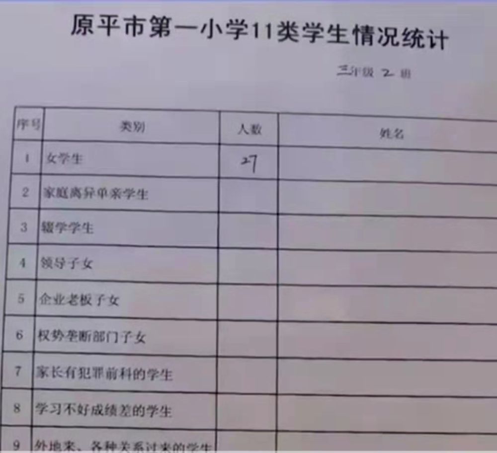 据澎湃新闻此前报道,山西忻州原平市第一小学一张情况统计表将学生划为11类,其中包括“领导子女”“权势垄断部门子女”“企业老板子女”“学习不好成绩差的学生”“外地来、各种关系过来的学生”等。11月2日,原平市教育局回应称,知晓该事件,已进行处理。