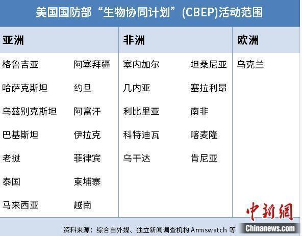 美国国防部“生物协同计划”(CBEP)活动范围。制图:中新网 甘甜