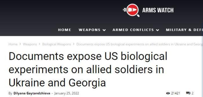 记者搜索发现,曾曝光美方的独立新闻调查机构Armswatch在2022年1月25日抛出一则新消息,称泄漏文件显示,美方曾采集乌克兰4400名士兵和格鲁吉亚1000名士兵的血样,进行生物学实验。