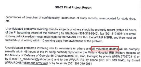 文件中提及如有志愿者死亡,事件需在48小时内,报告给格鲁吉亚军方医院和沃尔特·里德陆军研究所。沃尔特·里德陆军研究所是美国国防部管理的最大的生物医学研究机构。