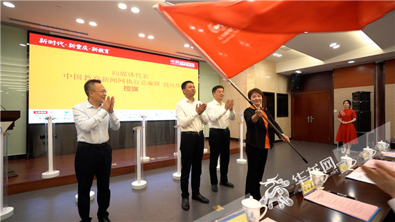 市委教育工委书记、市教委主任刘宴兵,市委网信办副主任吴勇军,重庆大学党委副书记冯业栋向媒体代表、中国教育新闻网执行总编辑段风华授旗。