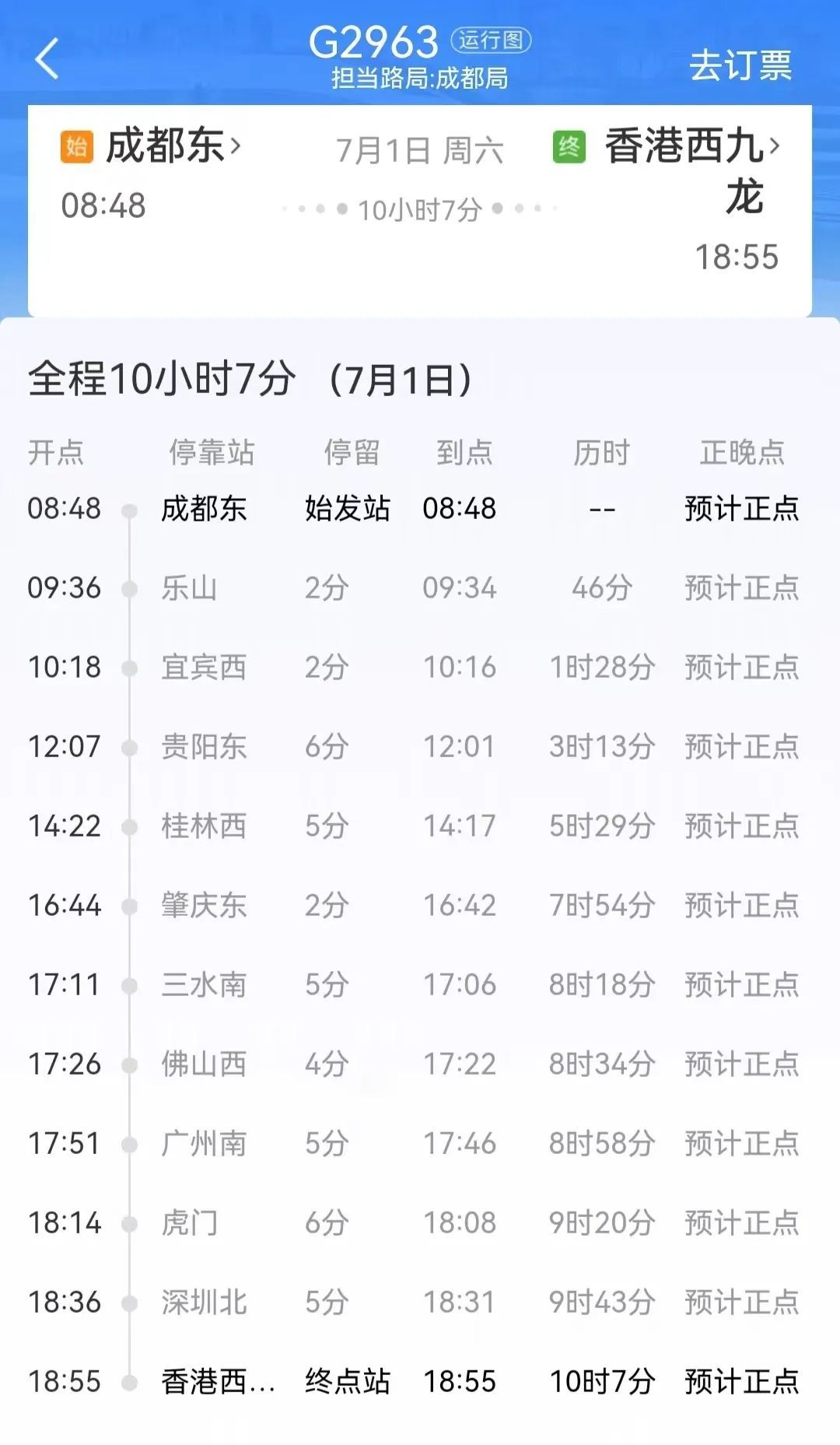 7月1日零时起,随着全国铁路实行新的列车运行图,成都东至香港西九龙跨境G字头动车组列车将首次开行,蓉港两地间将实现一车快速直达。