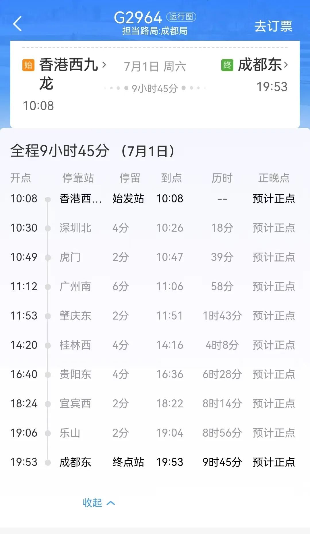 成都往返香港高铁列车由中国铁路成都局集团有限公司成都客运段担当值乘任务,列车将途经乐山、宜宾、贵阳、桂林、广州、深圳等城市,全程运行时间约10小时。