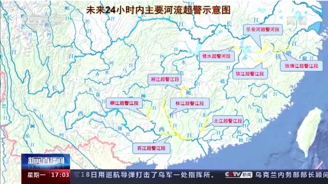 预计未来24小时内,珠江流域西江中下游,广西桂江,广东北江,湖南湘江,江西修水、信江、乐安河,浙江钱塘江等河流部分江段维持超警,广西柳江将超警。