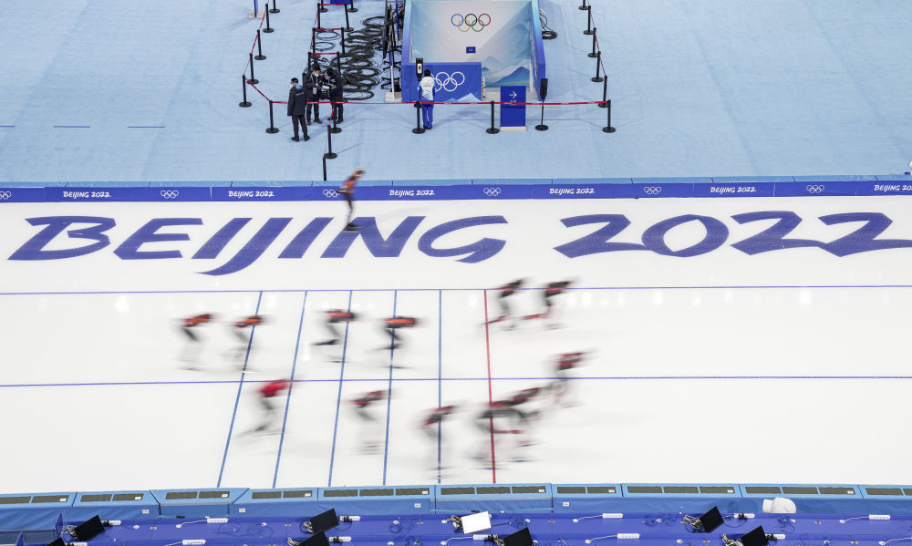 1月28日,速度滑冰运动员在国家速滑馆“冰丝带”训练。