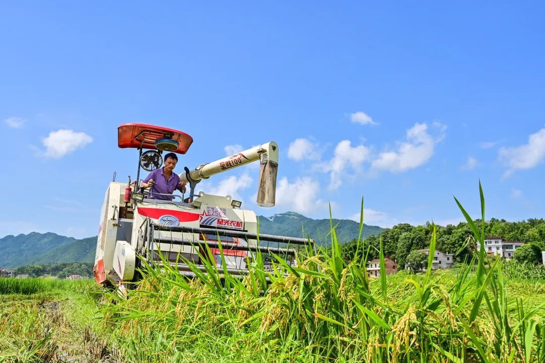 小暑时节,湖南省娄底市双峰县井字镇花桥村双季稻种植示范基地,农民驾驶收割机收割早稻。(李建新/摄)