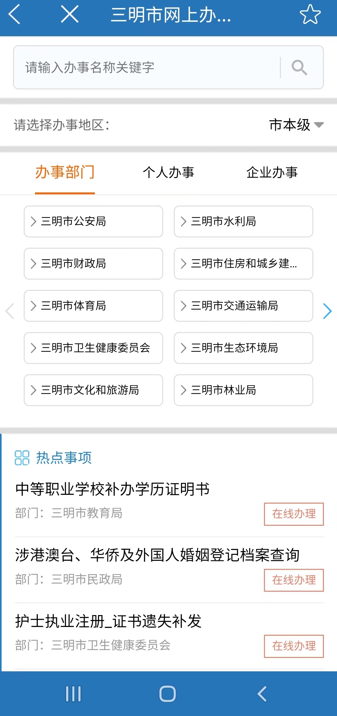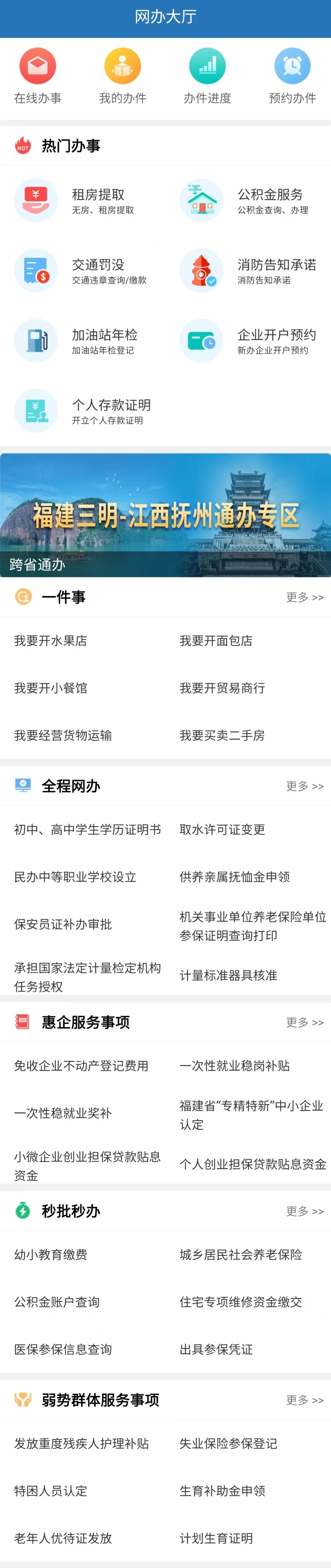 三明市委市政府全面整合政务服务资源,向公众提供覆盖医疗、教育、社保、出行等城市服务,把e三明打造成“全方位、全天候、全参与”网上公共服务平台,实现了“让数据多跑路,让群众少跑腿”,走好新时代网上群众路线。全市322个部门(含县级)29297项审批服务事项入驻e三明网上办事板块,其中26892项实现了全程网办。